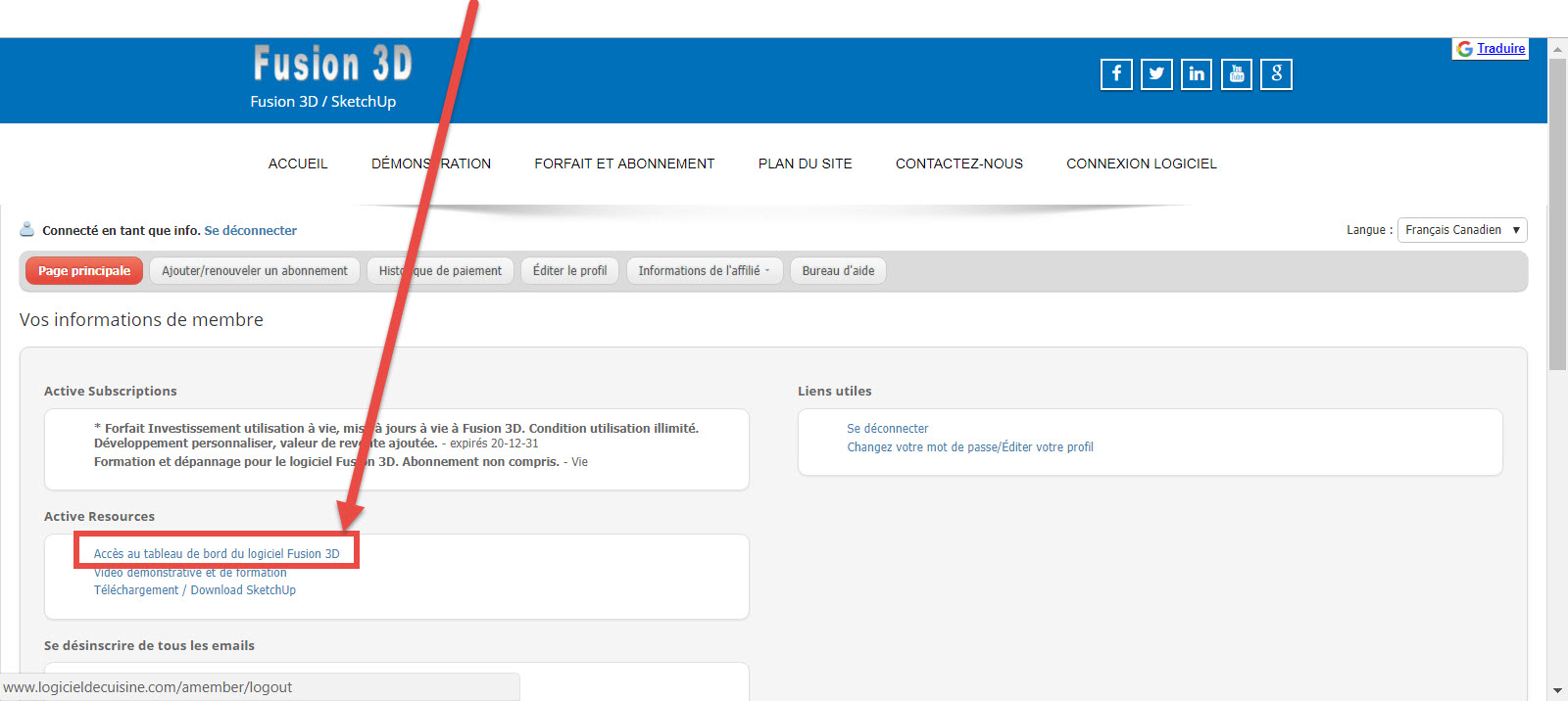 Après votre abonnement à Fusion 3D dans la page principale du site Web fusion3d.ca,