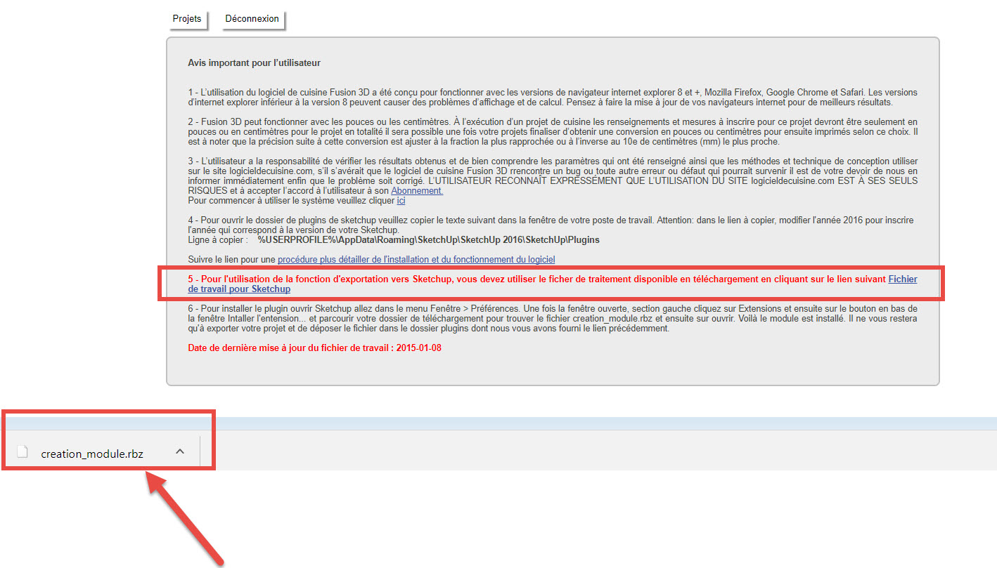 Vous rendre à la cinquième ligne et cliquer sur le lien Fichier de travail pour Sketchup afin de télécharger Création.module.rtz qui apparaît en bas de page à gauche AVIS : le navigateur utilisé pour la démonstration est Google