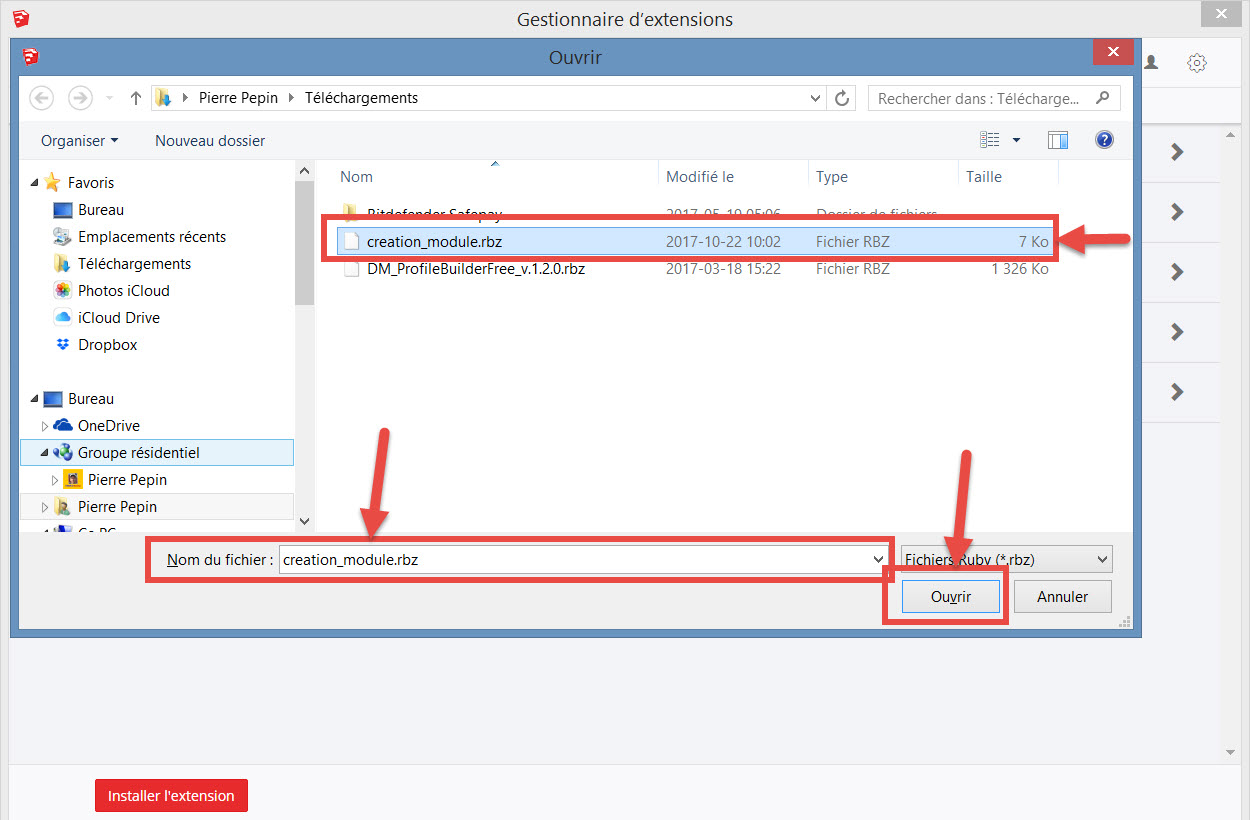 Dans le premier rectangle rouge, localisez Création.module.rbz, sélectionnez-le et cliquez sur Ouvrir.
