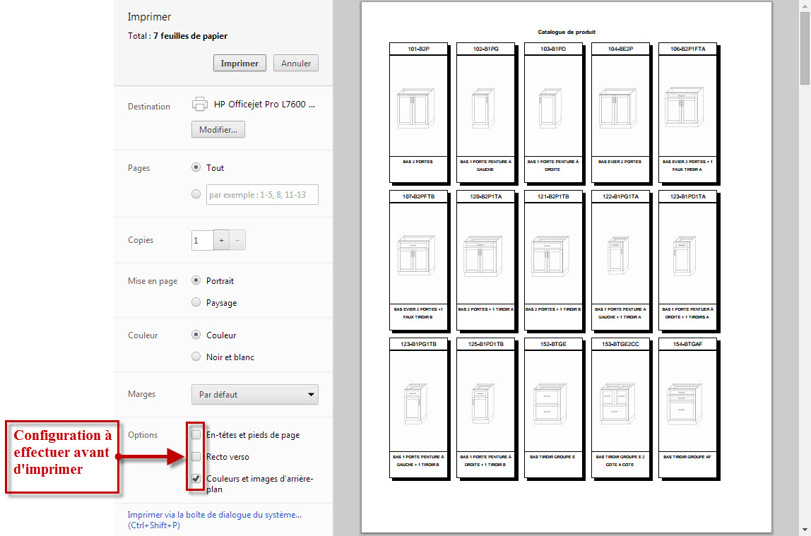 Configuration à effectuer à l’impression du catalogue des caissons d’armoires de cuisine. (Exemple pour le navigateur Google Chrome)