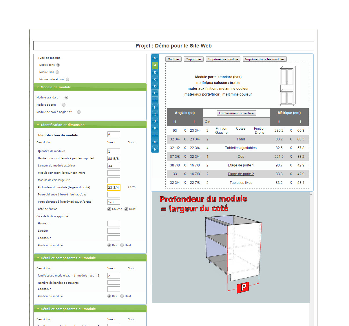 • Liste des quantités de composantes, matériaux, pieds carrés, pieds linéaires de bandes de chant, etc., le tout est littéralement calculé automatiquement, avec précision.