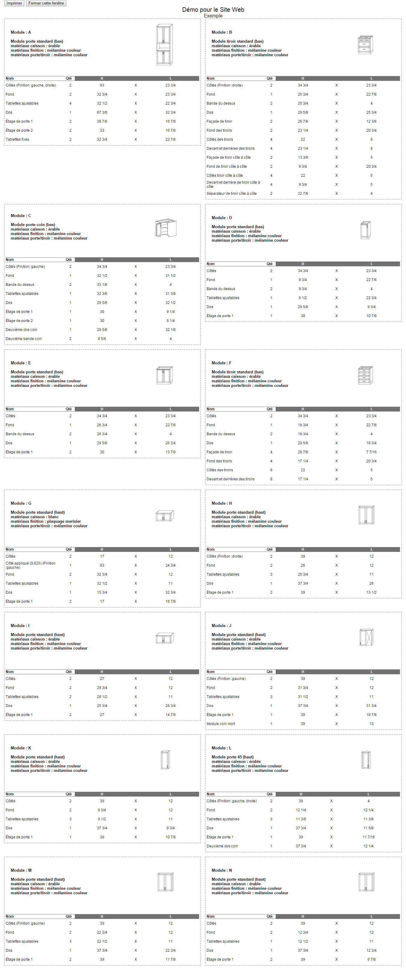 Liste des composants par module de cuisine, qui est facile à suivre, idéale pour l’assemblage et pour faire la vérification de vos modules et composants qui ont été renseignés dans le but de prévenir des erreurs ou pour apporter des modifications. Le débitage peut également être effectué à partir de cette liste selon votre choix : liste imprimable de l’ensemble des modules ou possibilité d’imprimer un seul module au choix.