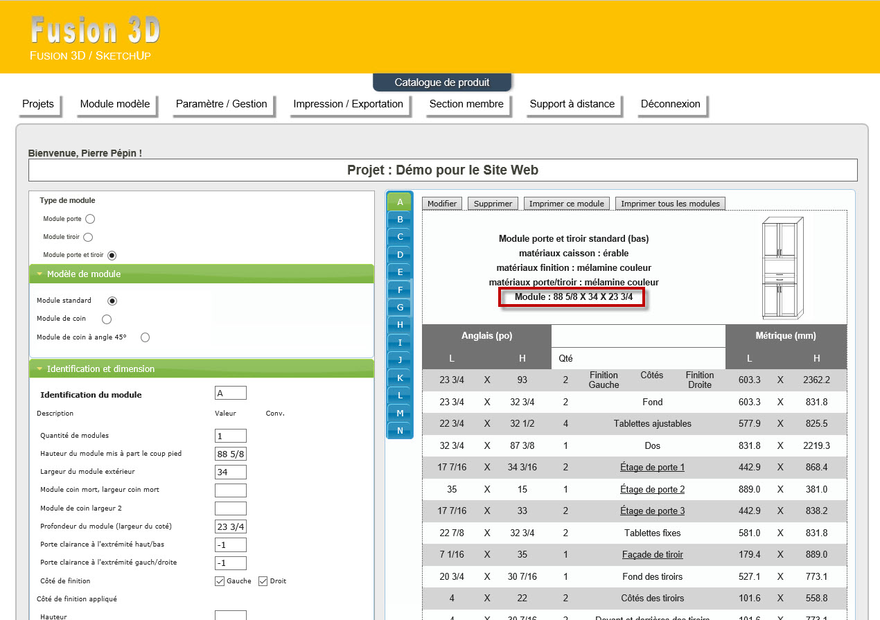 La principale nouveauté : le catalogue est pré-configuré avec des données et des modèles 3D de caissons d’armoires de cuisine. Il suffit simplement de cliquer sur le modèle 3D désiré pour obtenir la liste de débitage de tous ses composants ainsi qu’un dessin 3D de chaque caisson, et le tout est modifiable et ajustable selon vos préférences d’assemblage.